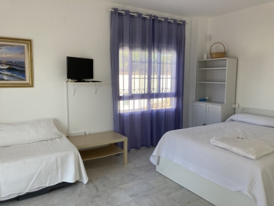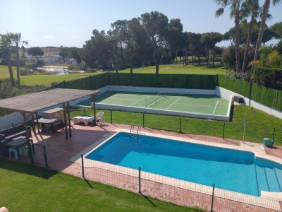 En la planta superior hay una habitación con 4 plazas (cama de matrimonio y cama nido). Dispone de TV y un baño propio muy amplio con jacuzzi. Además, tiene una terraza solárium con vistas al jardín y al campo de golf.